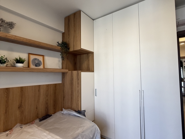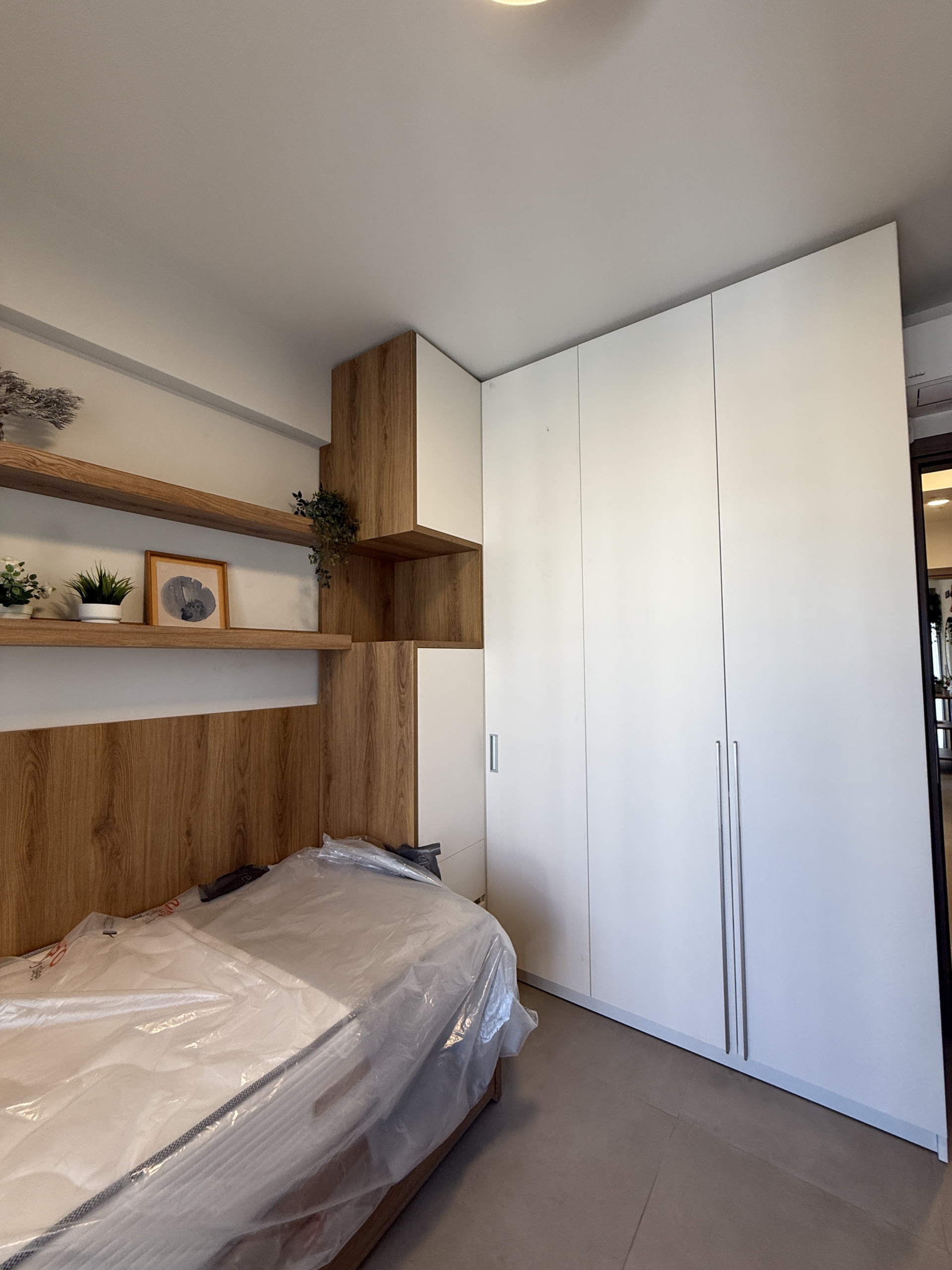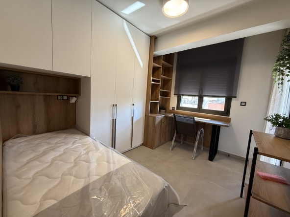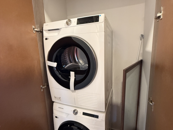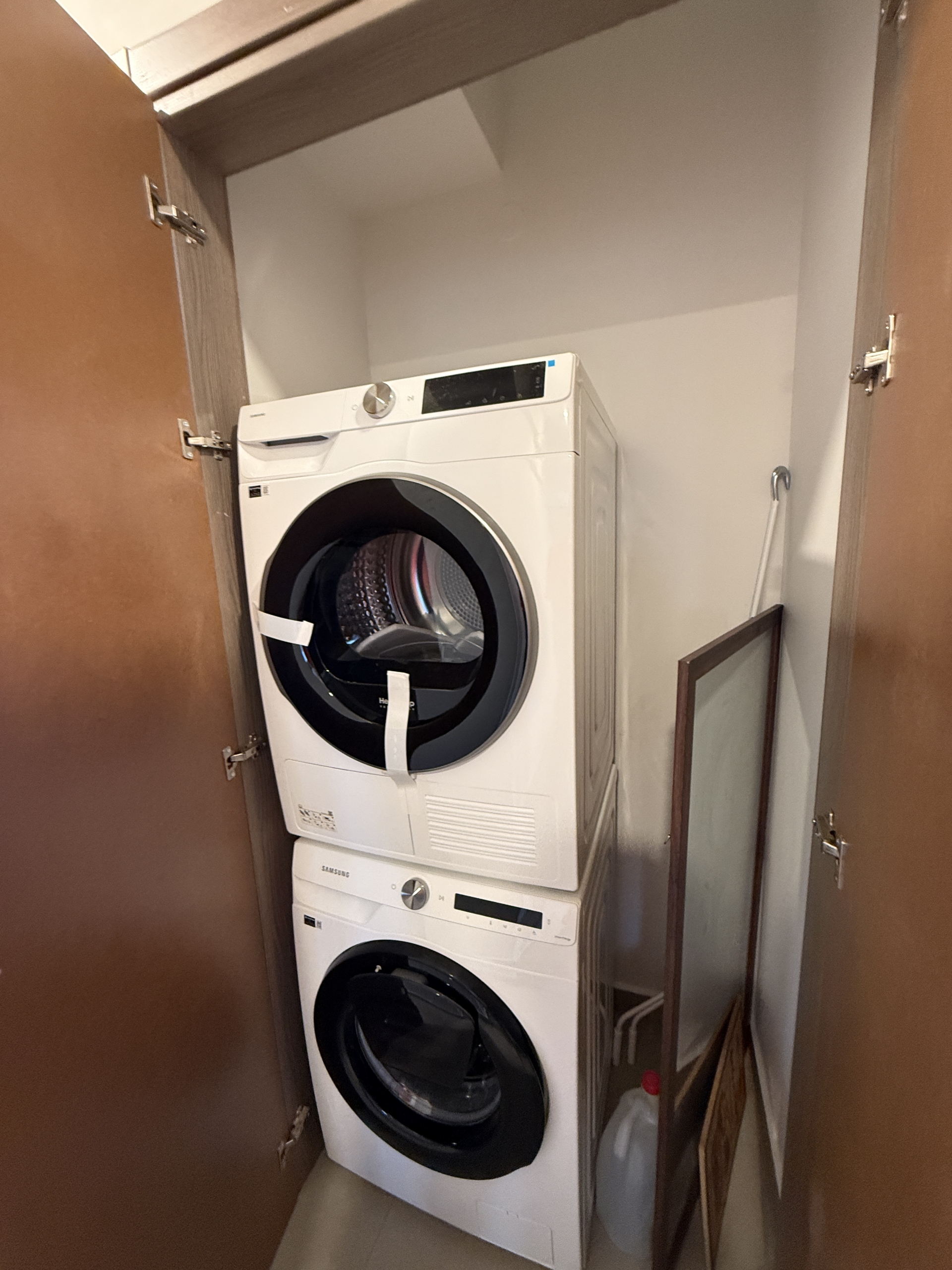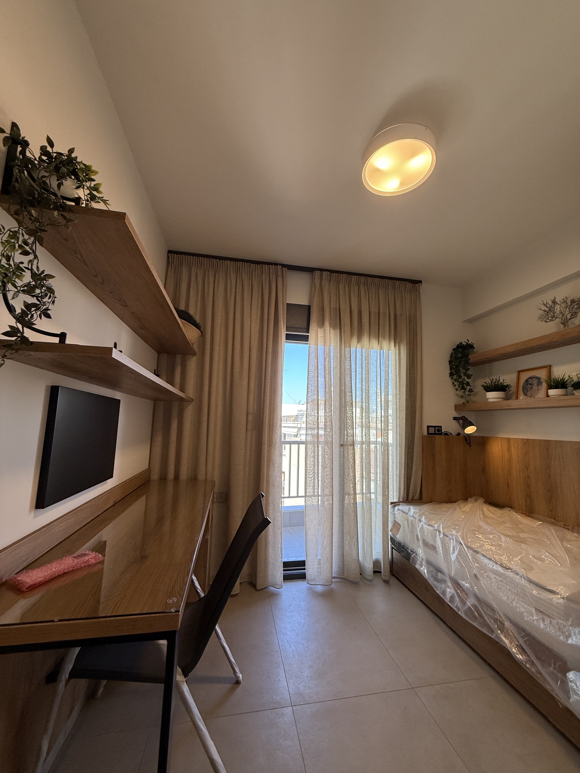 The three bedrooms are located at the back, offering peace and privacy, the two are smaller rooms with single bed , closets and a desk. The largest bedroom has a double bed and lots of storage space. It also has a wc and a bathroom. As well as a separate cabinet where the washing machine and dryer are located. The balconies are perimeter and there is a closed parking space (a short distance away)